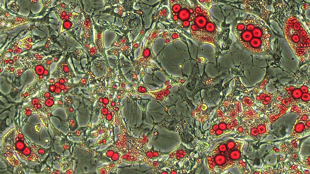 Figur 1: Grindhval og isbjørn fibroblaster utsatt for adipocytt differensierings cocktail. Cellene er behandlet med OilRedO, et fargestoff som farger fett-molekyler røde. Det er tydelig at denne behandlingen fungerer på isbjørn celler men ikke på grindhval celler.
