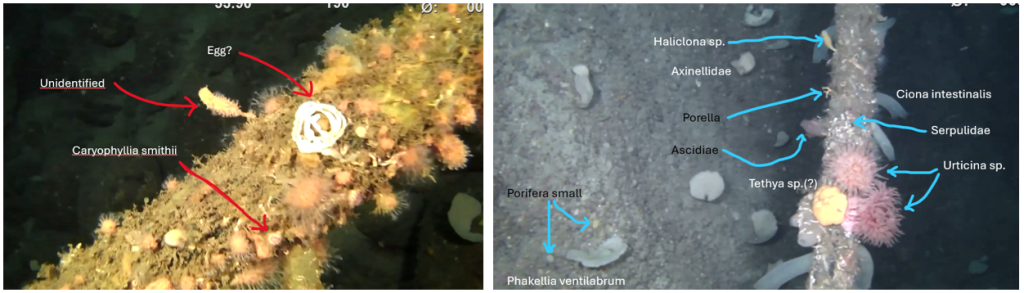 Metoden var slik at eg stoppa videoen kvart 20. sekund og kalla det eit bilete. For kvart bilete skreiv eg ned Metadata (t.d. type botnsubstrat, djupne, grad av helning, om kabel var på botn/i heng eller nedgravd) samt Artsdata (artar sett på og rundt kabel). Når det gjeld artsdata var det somme gonger lett å identifisere til art, medan andre gonger ikkje mogleg. Eg forsøkte alltid å finne den artsgruppa som var mest skildrande, men på mange individ skreiv eg også «Unidentified». Dette var ofte fordi individa var for langt unna eller videomaterialet var for uklart til å identifisere. Døme frå korleis eg arbeida med videomateriale kan de sjå på dette bildet: