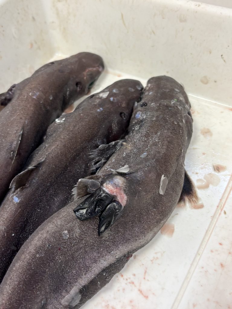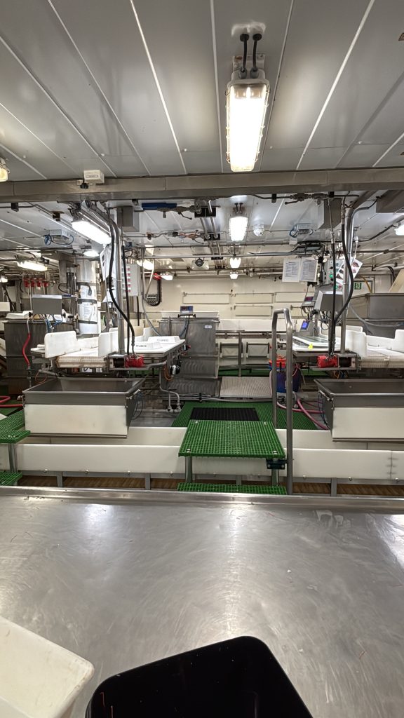 Sadly, we have now had to dock at a harbor sue to unforeseen circumstances. Since there is also a storm approaching, we took the opportunity to stay docked to let it pass, as it would not only be unpleasant for, but also “useless” as we would not be able to set out the nets. I have to say that for now I do enjoy the work. I was a bit demotivated at the start as everything was very chaotic and we got no sharks with parasites for me to work with. Furthermore, in my shift there are three researchers from the IMR, who are very efficient in their work so sometimes it feels as I am just standing in the way. My personal moments so far are when the trawls come in and all contents are sent down from the deck to the lab. Everything comes down pouring onto the «conveyer belt» and the sorting of the fish begins. We separate the shrimps from any other fish, then the sharks are placed in their own box, and finally any other big fish is separated according to the species for later dissection.